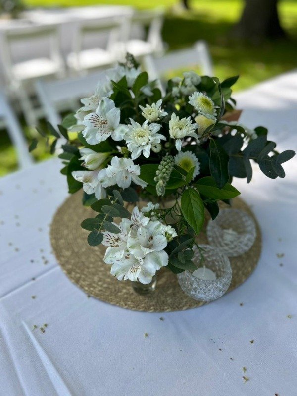 Estos centros florales llevan la combinación de 4 flores naturales de estación en delicados colores (blanco, manteca y rosa suave) y follajes varios (generalmente las flores utilizadas son lisianthus, y/o san vicentes, y/o margaritas, y/o crisantemos baby, y/o caspias, y/o alstroemerias, y/o gonfrenas, y/o clavelinas)